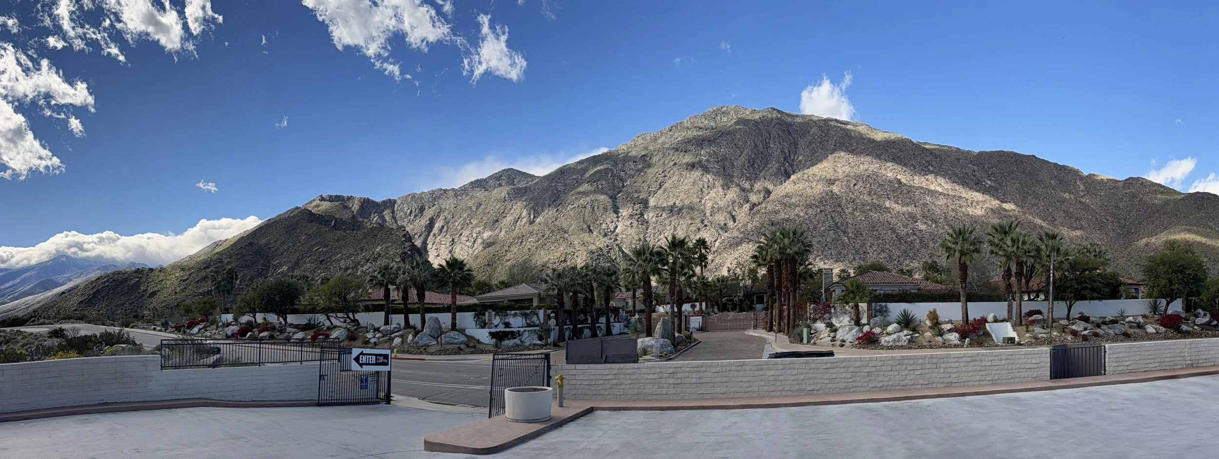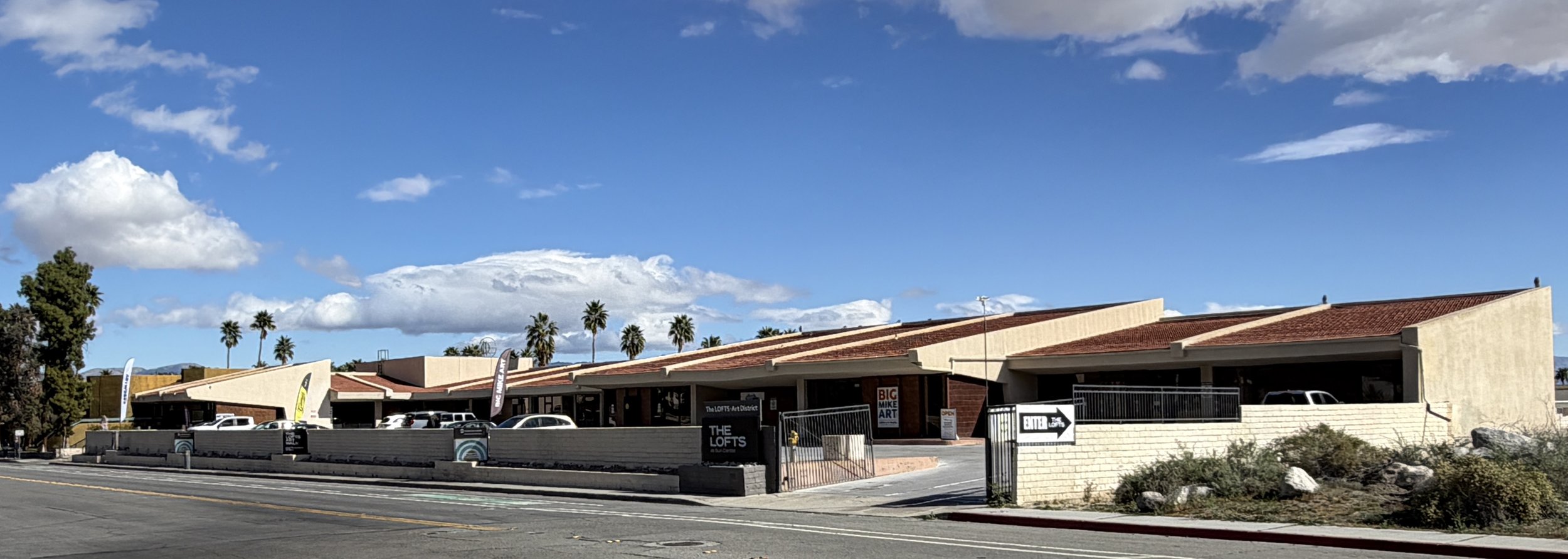 Set at the base of Tahquitz Canyon in South Palm Springs, Big Mike Art Gallery & Studio occupies a Richard Harrison–designed mid-century modern building within The Lofts Art District. The gallery sits beneath the San Jacinto Mountains, where desert light shifts across stone ridgelines, palms, and canyon walls throughout the day.