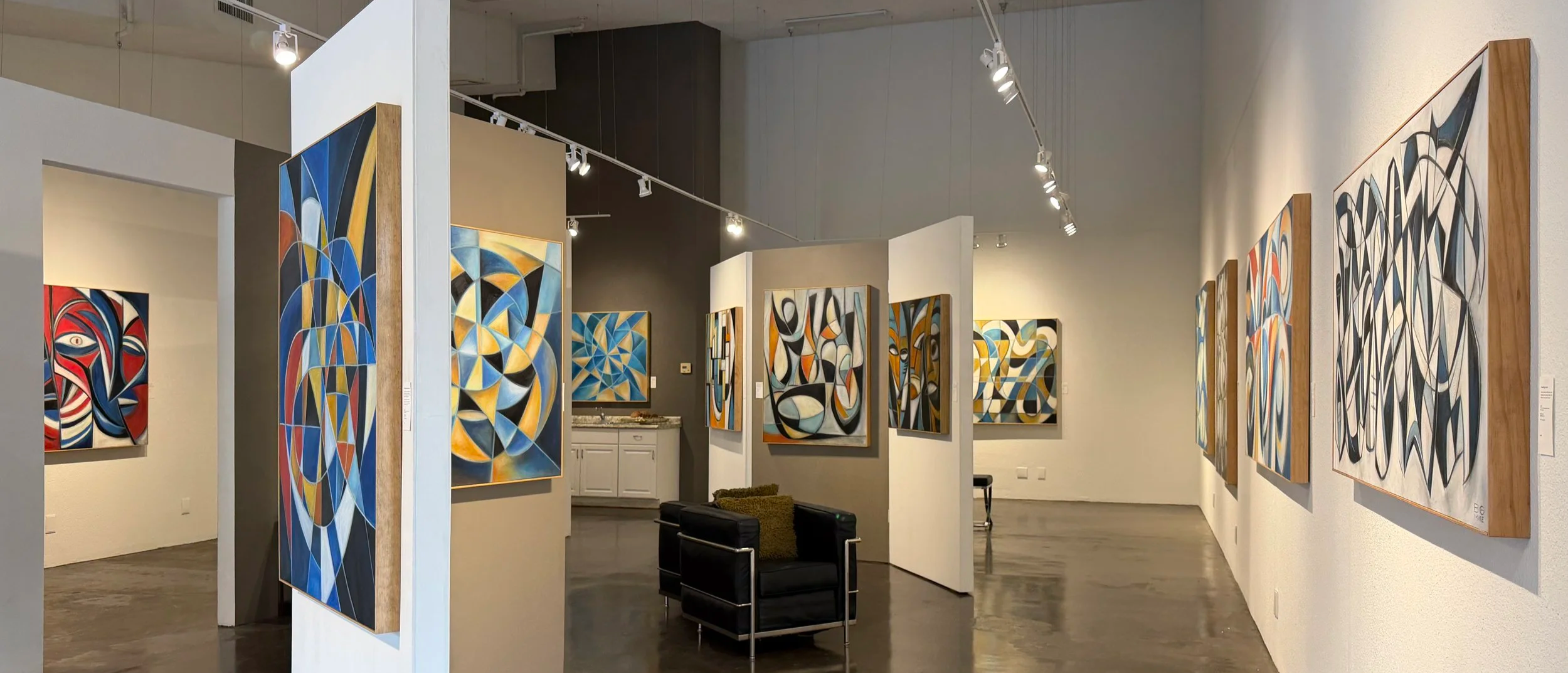 This environment is not backdrop — it is structure. The geological forms of Tahquitz Canyon, the architectural clarity of Palm Springs modernism, and the disciplined geometry of mid-century design converge in Big Mike’s Modern Sacred Geometry series. Inside 20-foot pitched ceilings, layered abstraction reflects both landscape and architecture: measured, luminous, and intentional.