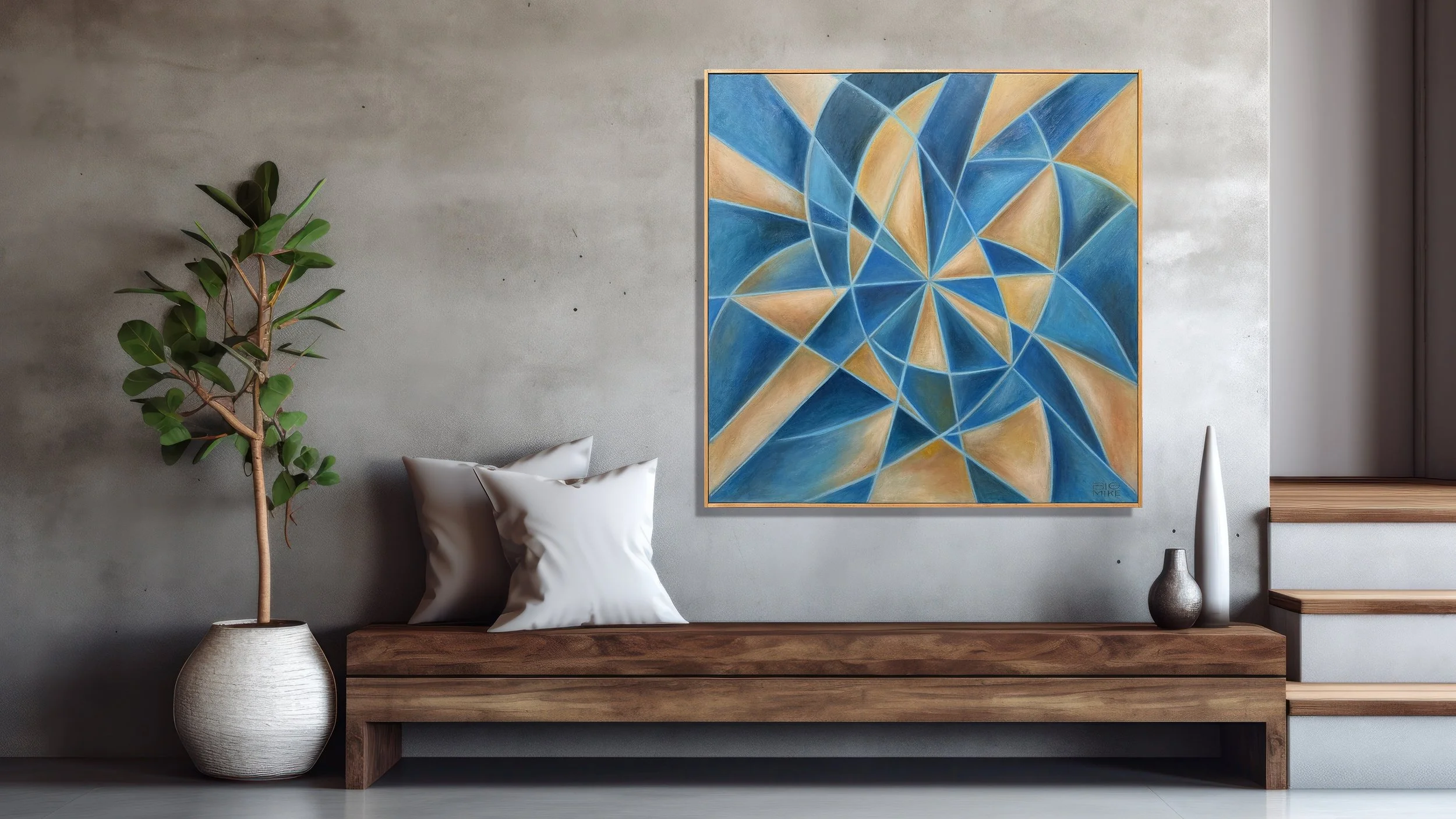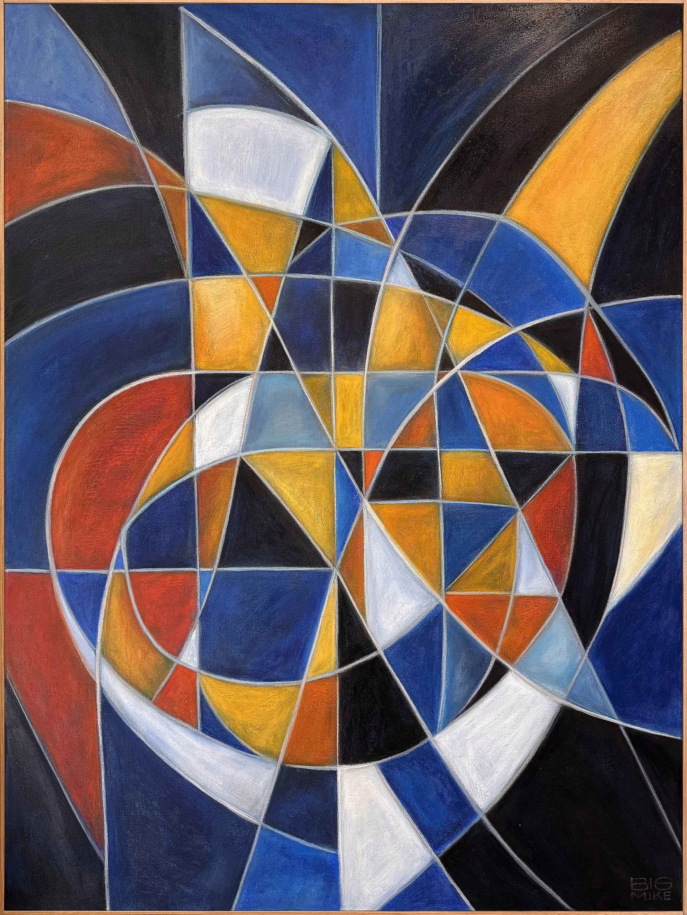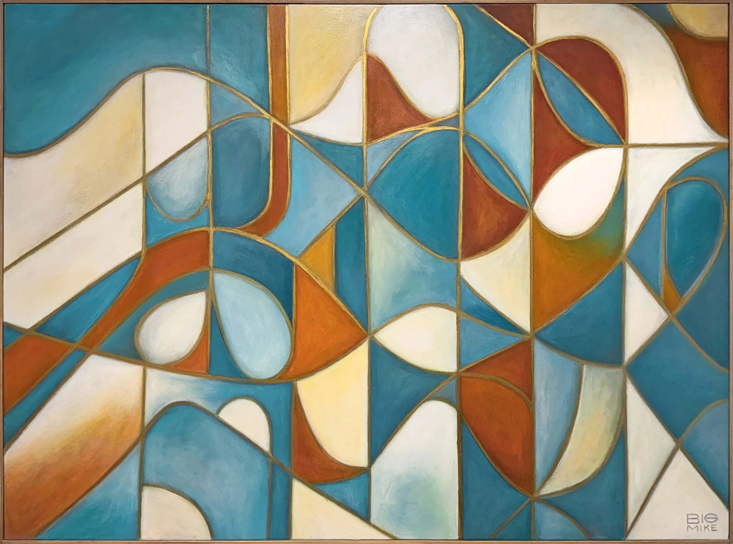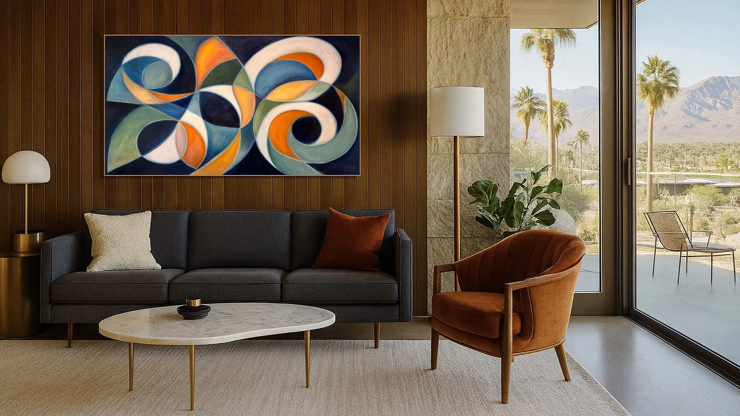 My Modern Sacred Geometry abstract painting series explores my stunning desert home and all it’s sublime modern style, eccentric history and ferocious natural beauty. I’m driven to re-imagine the Mid-century vibe with exotic, sacred, geometric worlds and lay it all down in a torrent of smudges, swirls, whips & hatches. Come visit my Gallery/Studio in Downtown Palm Springs, have a glass of wine and see what’s on the easel.