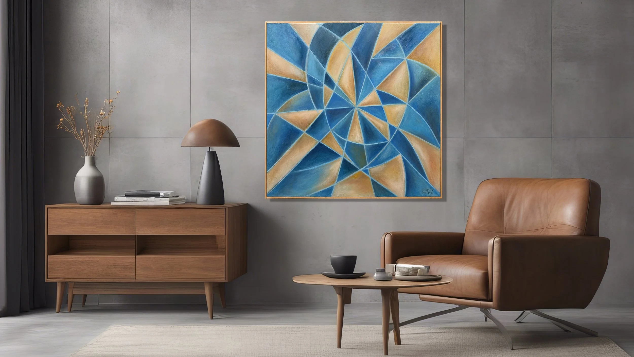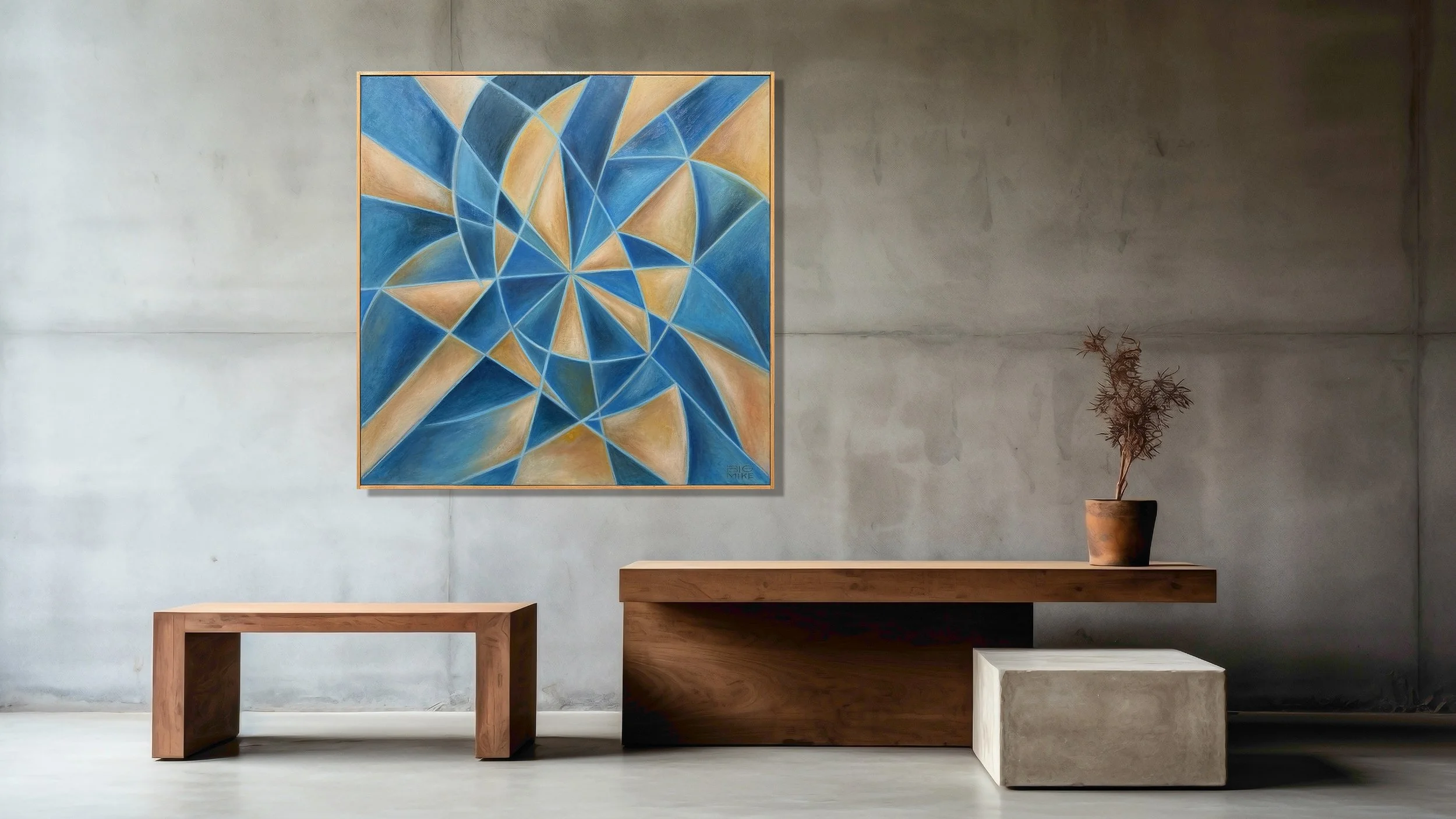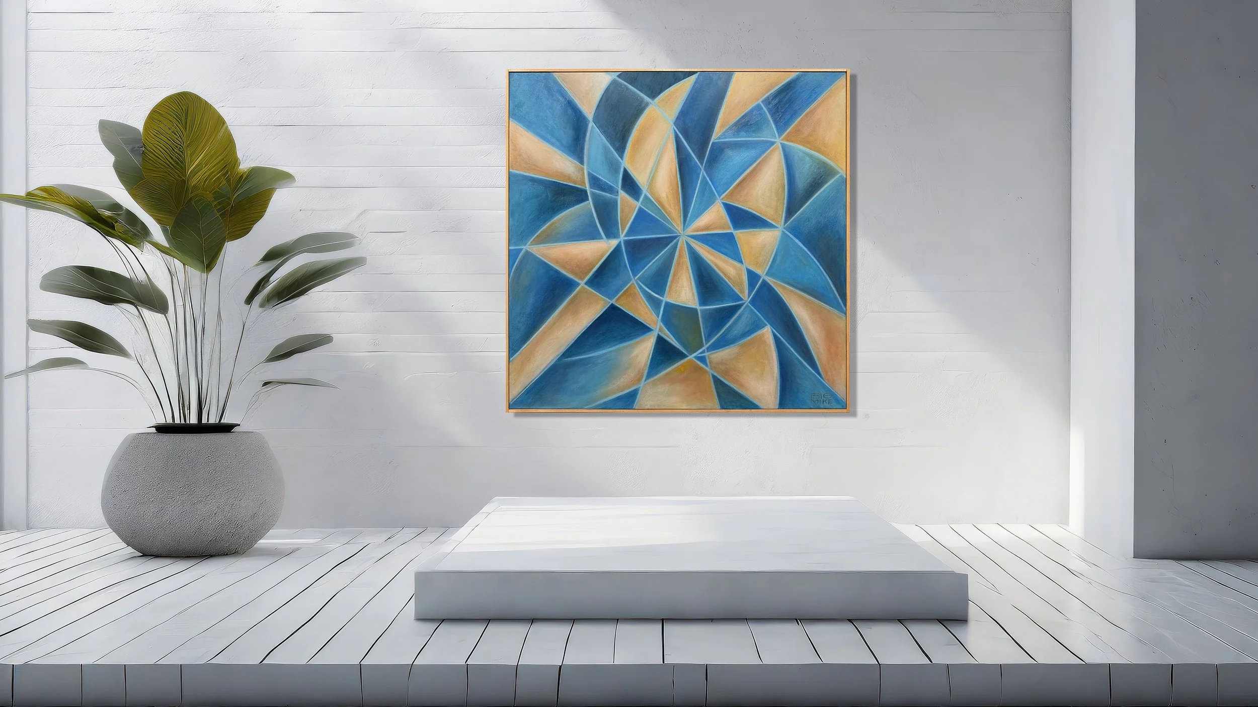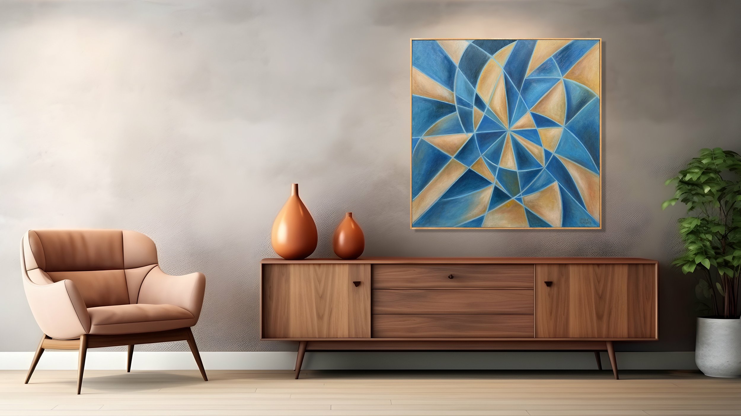 My Modern Sacred Geometry abstract painting series explores my stunning desert home and all it’s sublime modern style, eccentric history and ferocious natural beauty. I’m driven to re-imagine the Mid-century vibe with exotic, sacred, geometric worlds and lay it all down in a torrent of smudges, swirls, whips & hatches. Come visit my Gallery/Studio in Downtown Palm Springs, have a glass of wine and see what’s on the easel.
