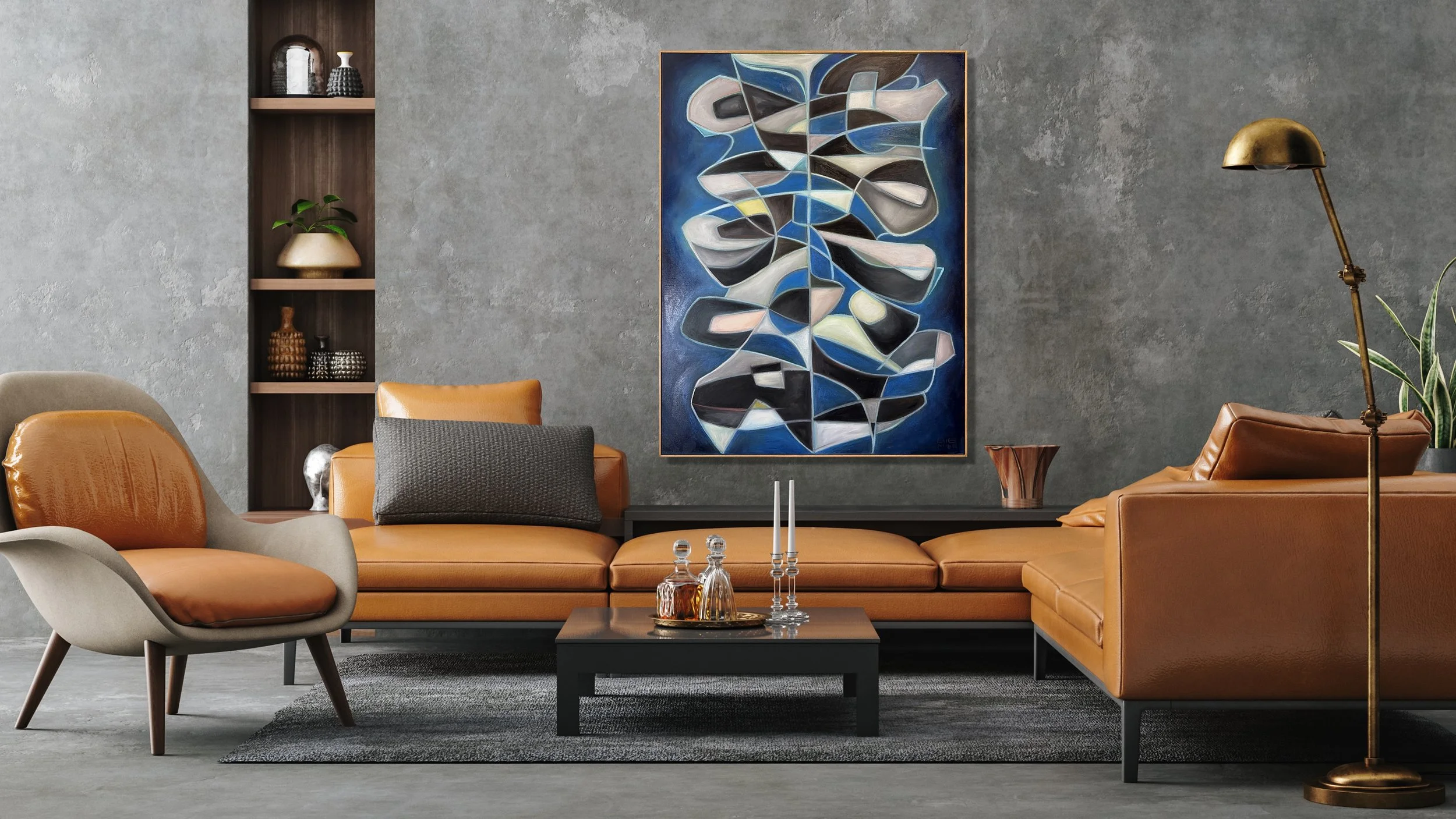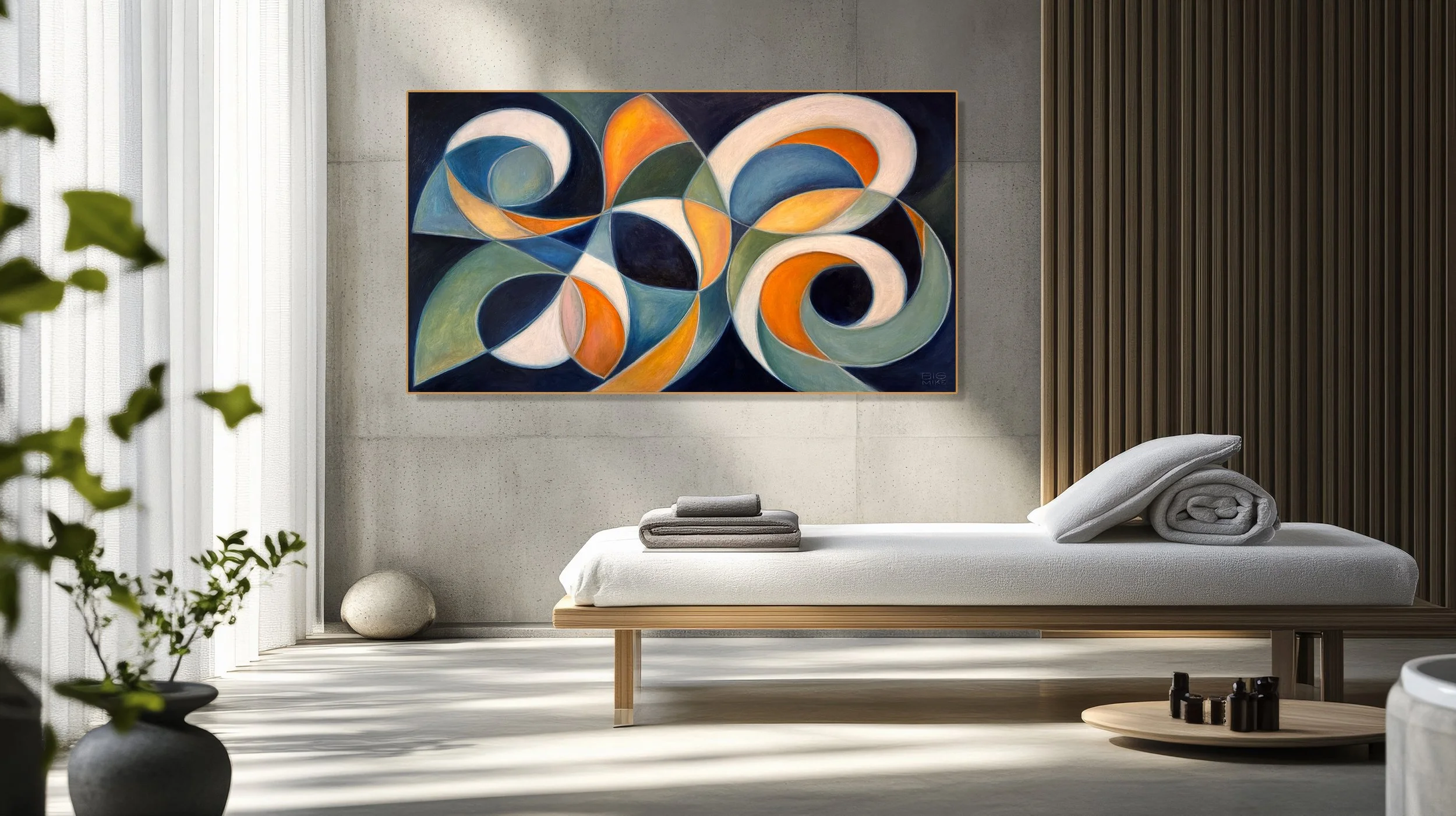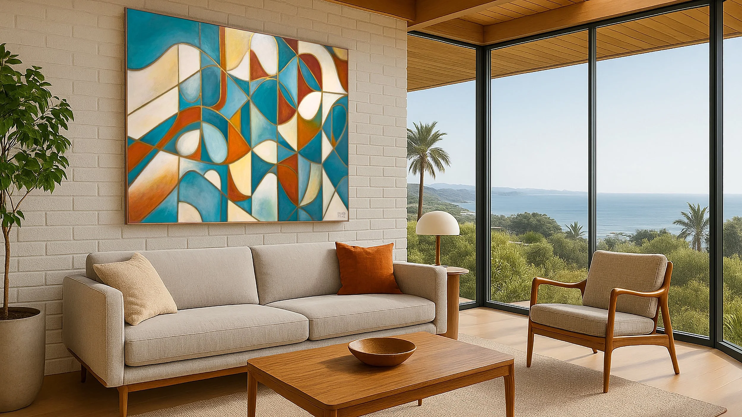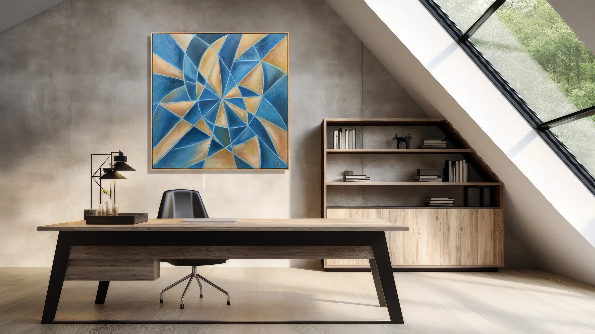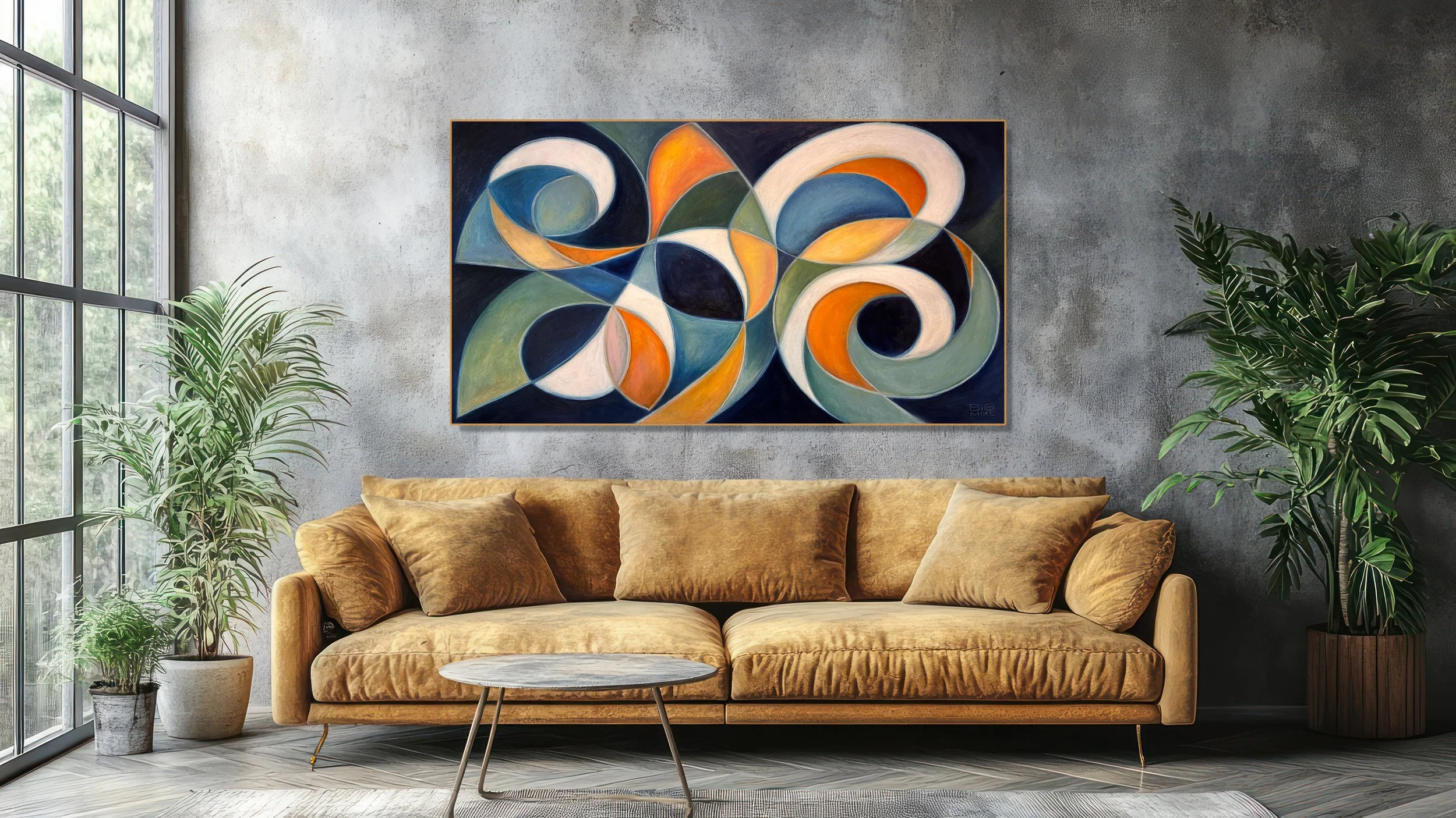 My Modern Sacred Geometry abstract painting series explores my stunning desert home and all it’s sublime modern style, eccentric history and ferocious natural beauty. I’m driven to re-imagine the Mid-century vibe with exotic, sacred, geometric worlds and lay it all down in a torrent of smudges, swirls, whips & hatches. Come visit my Gallery/Studio in Downtown Palm Springs, have a glass of wine and see what’s on the easel.