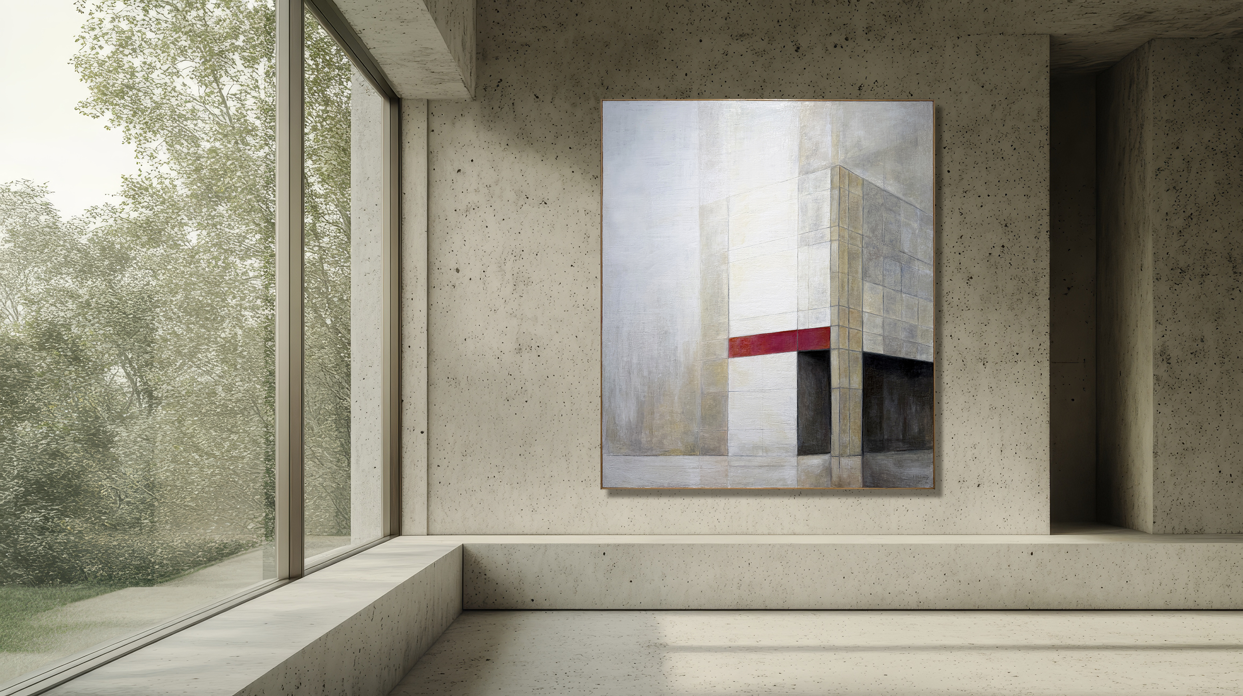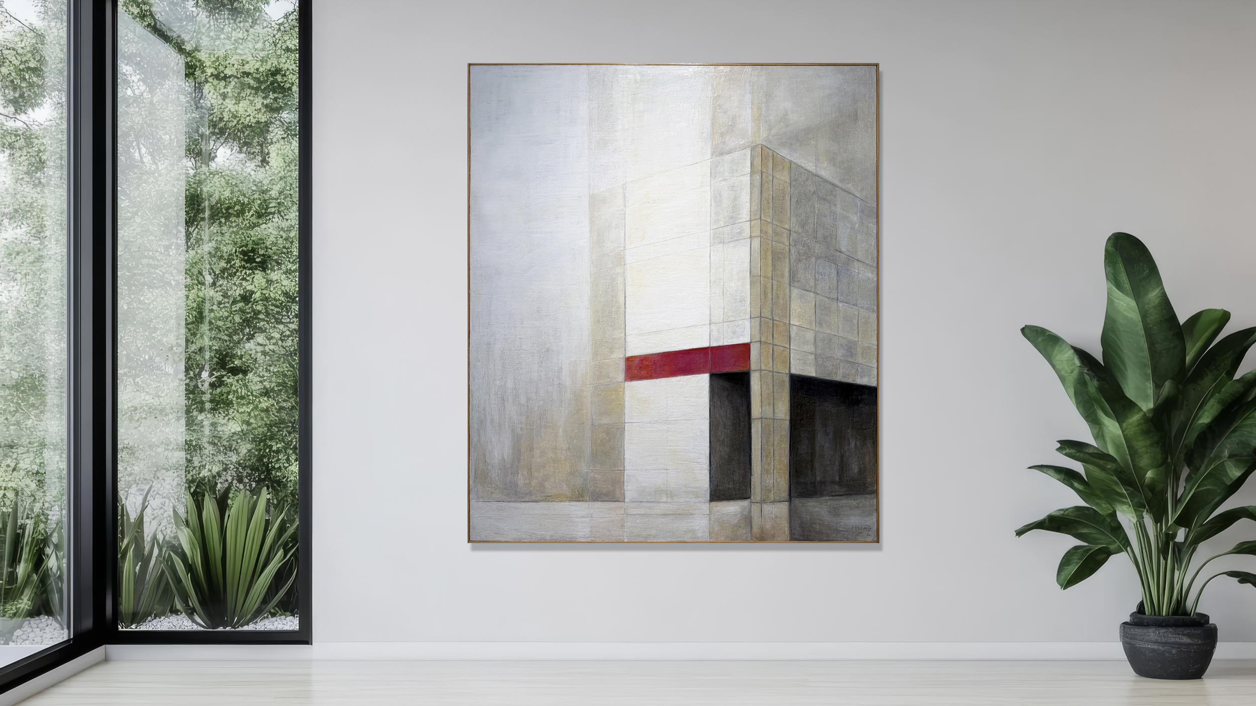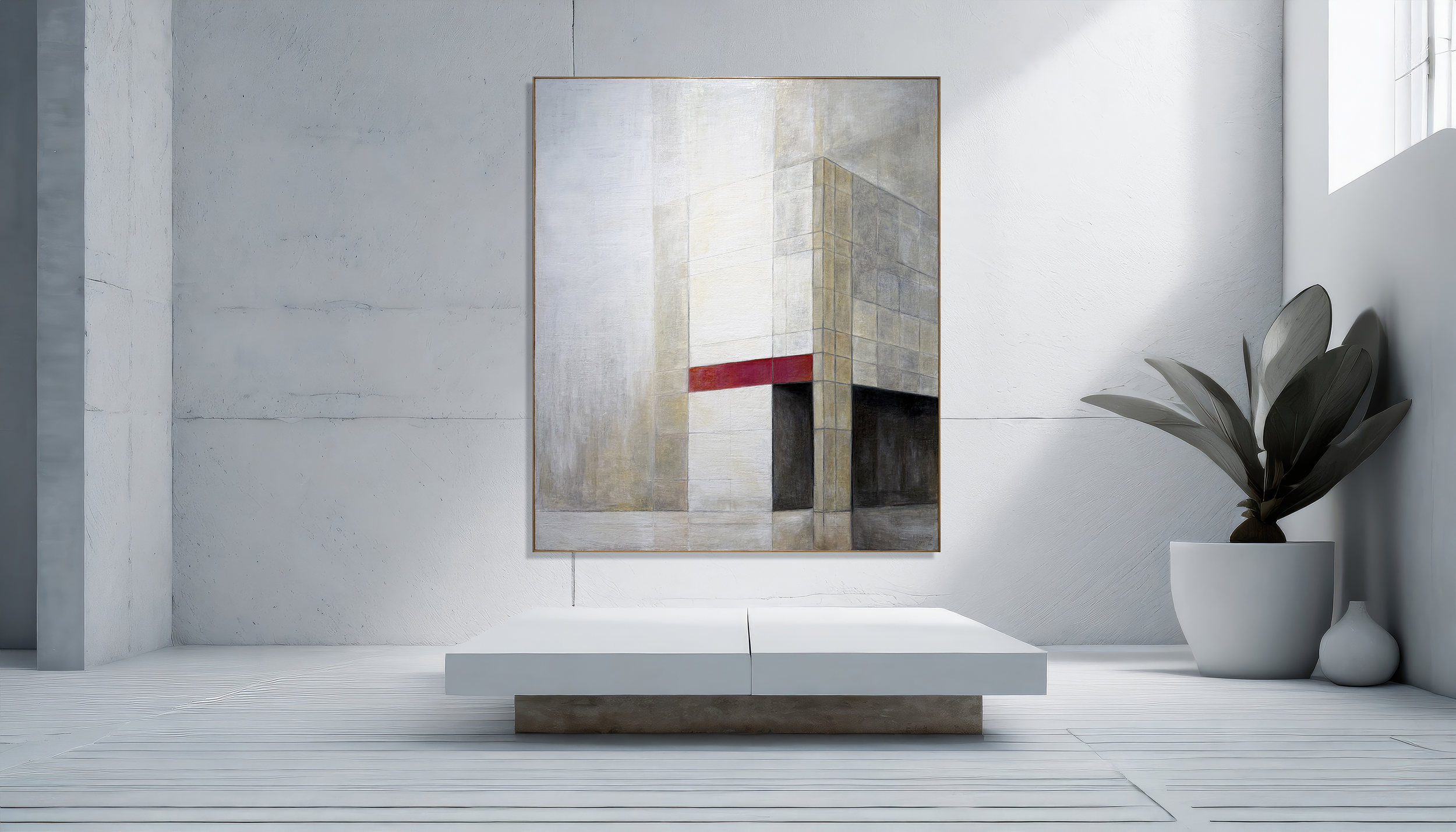 Working primarily on large-scale canvases, I re-imagine modernism through layered, sacred, geometric worlds built from gesture, rhythm, and architectural form.